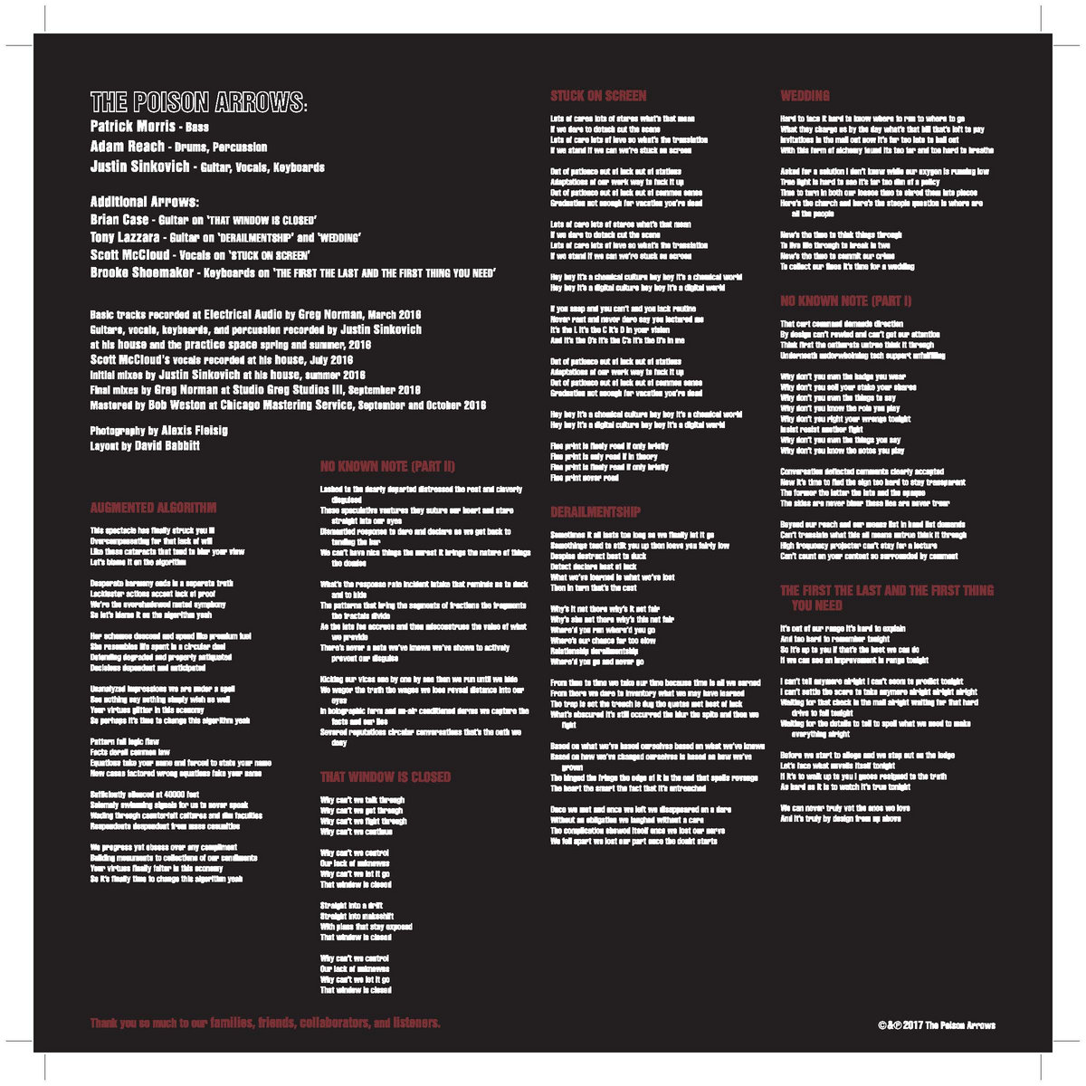 Basic tracks recorded at Electrical Audio by Greg Norman Overdubs recorded by Justin Sinkovich Mastered at Chicago Mastering Service by Bob Weston Vinyl LP limited to 500 Download included High quality vinyl manufacturing at RTI High quality printed jacket and insert Cover photos by Alexis Fleisig (Girls Against Boys, Bellini, Soulside, Obits) Layout by David Babbitt